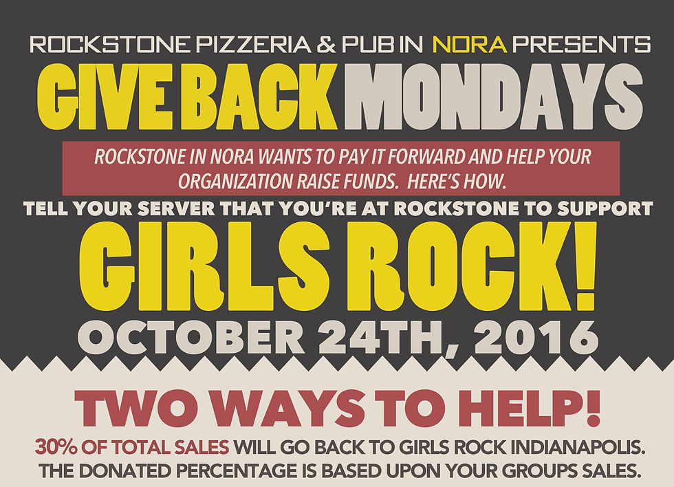 Are you wanting to feed the family and donate to a non-profit organization? Girls Rock! Indianapolis and Rockstone Pizza – Nora are partnering for giveback Mondays. Just mention Girls Rock and 30 percent of total sales will go to us! Yes, it really is just that simple. This can work with dine-in or carryout, just mention GRI to your server or the cashier at any time during your meal or checkout. Rockstone Nora is located at 1435 East 86th Street, Indianapolis, IN 46240 and is opened from 11 a.m. – 11 p.m.